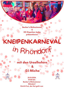Am 23.01.2026 ab 19 Uhr findet erstmals der Kneipenkarneval in Rhöndorf gemeinsam mit und in Becker‘s Wohnzimmer Rhöndorf statt. Der Eintritt ist frei, der Hut geht rum!