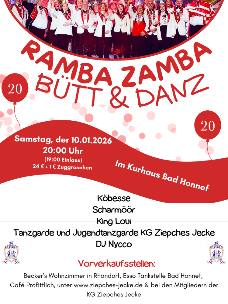 Jedes Jahr veranstalten wir im Januar die Karnevalssitzung "Ramba Zamba - Bütt un Danz" im Kurhaus in Bad Honnef. "Ramba Zamba" ist eine Sitzung ohne Elferratstisch und klassischem Programm. Bei uns tobt der Saal, es treten Tanzgarden und Bands auf - und der ein oder andere Büttenredner ist natürlich auch mit von der Partie. Es wird nicht nur gesessen, bei uns darf auch getanzt werden!